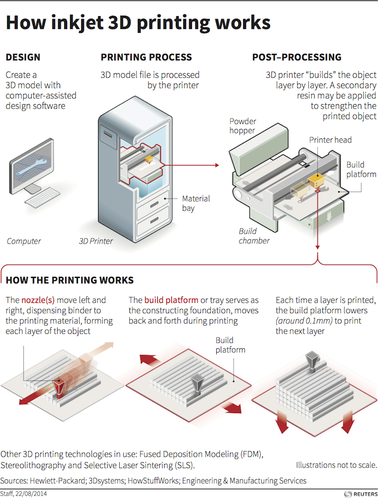 With 3D printing, what would have initially been a series of stages of production could be cut down to a designer at one end, and the printer or “manufacturer” at the other. The middle players would most likely be suppliers of raw materials or “ink”.